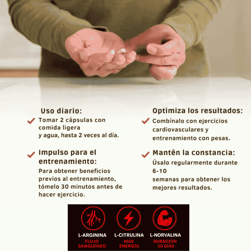 Se recomienda tomar de 2 cápsulas al día, preferiblemente 30–45 minutos antes de entrenar, con un vaso de agua. No exceder la dosis indicada en la etiqueta del envase.