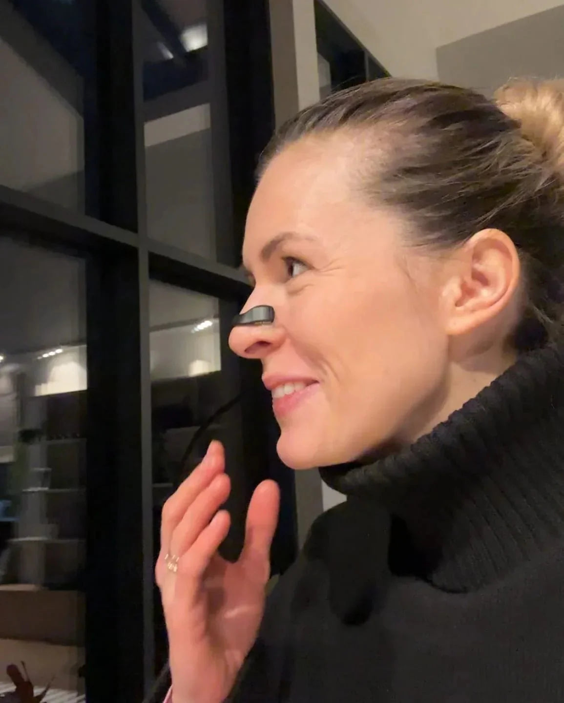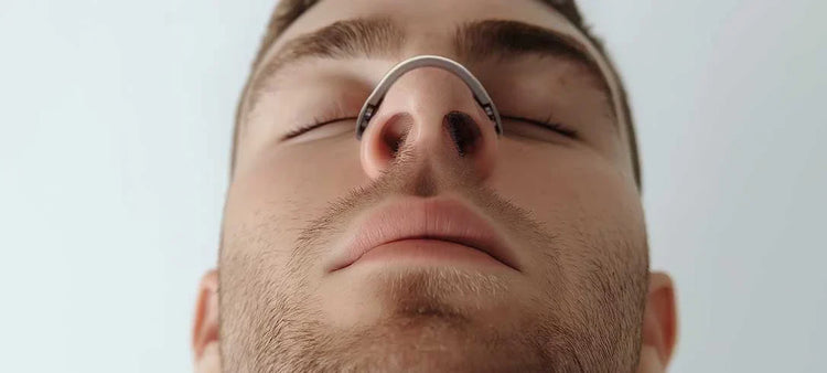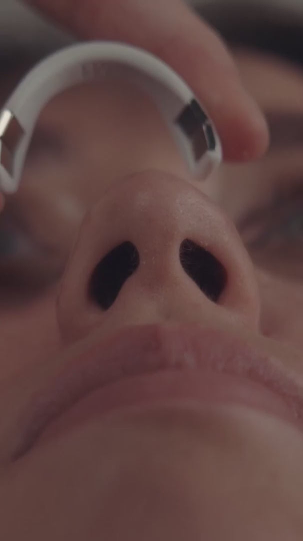 Primero se aplican las pestañas adhesivas en las fosas nasales y luego se coloca la banda magnética externa para abrirlas suavemente. El kit incluye un aplicador para facilitar el proceso.