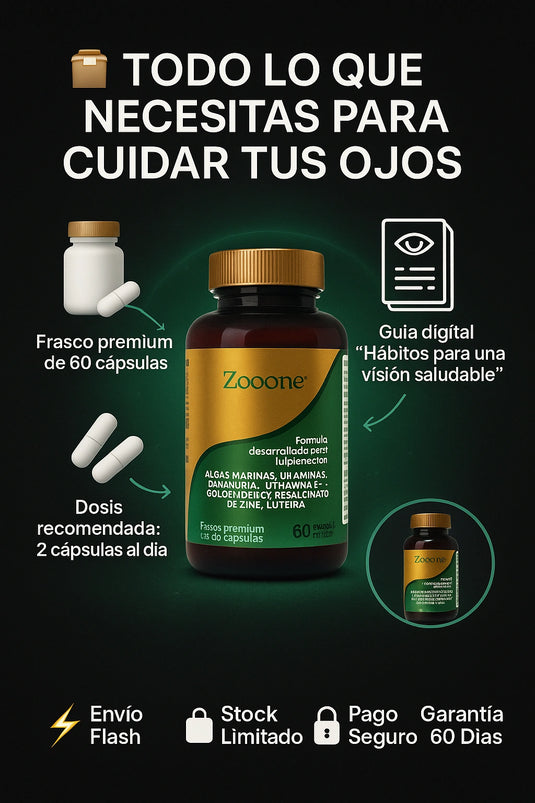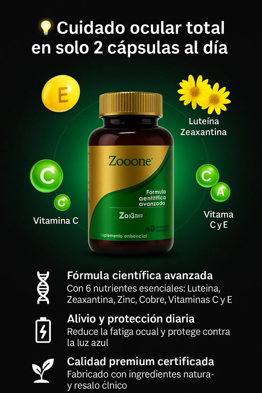 - Zinc & Cobre: minerales esenciales que apoyan el metabolismo ocular y la función visual normal.